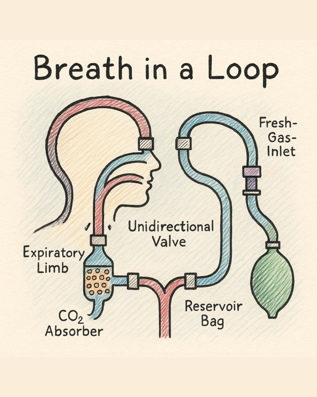 A breath leaves the patient, journeys through a maze of valves and chambers, touches the alchemy of soda lime, and returns — refined, cleansed, renewed.